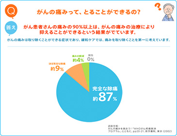 緩和ケアでは、痛みを取り除くことを第一に考えています。WHO(世界保健機関)は、「痛みに対応しない医師は倫理的に許されない」と述べています。痛みは、取り除くことができる症状であり、そのための緩和ケアを受ける権利は、誰にでもあるのです。