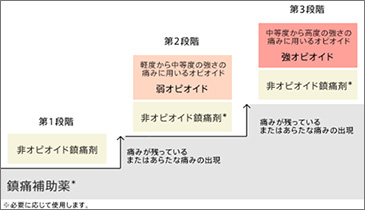 下の階段のような図は世界保健機構(WHO)が示している三段階除痛ラダー(WHO方式がん疼痛治療法)です。痛みは早期から、段階的に薬剤を使用して除痛を図ることが基本とされています。